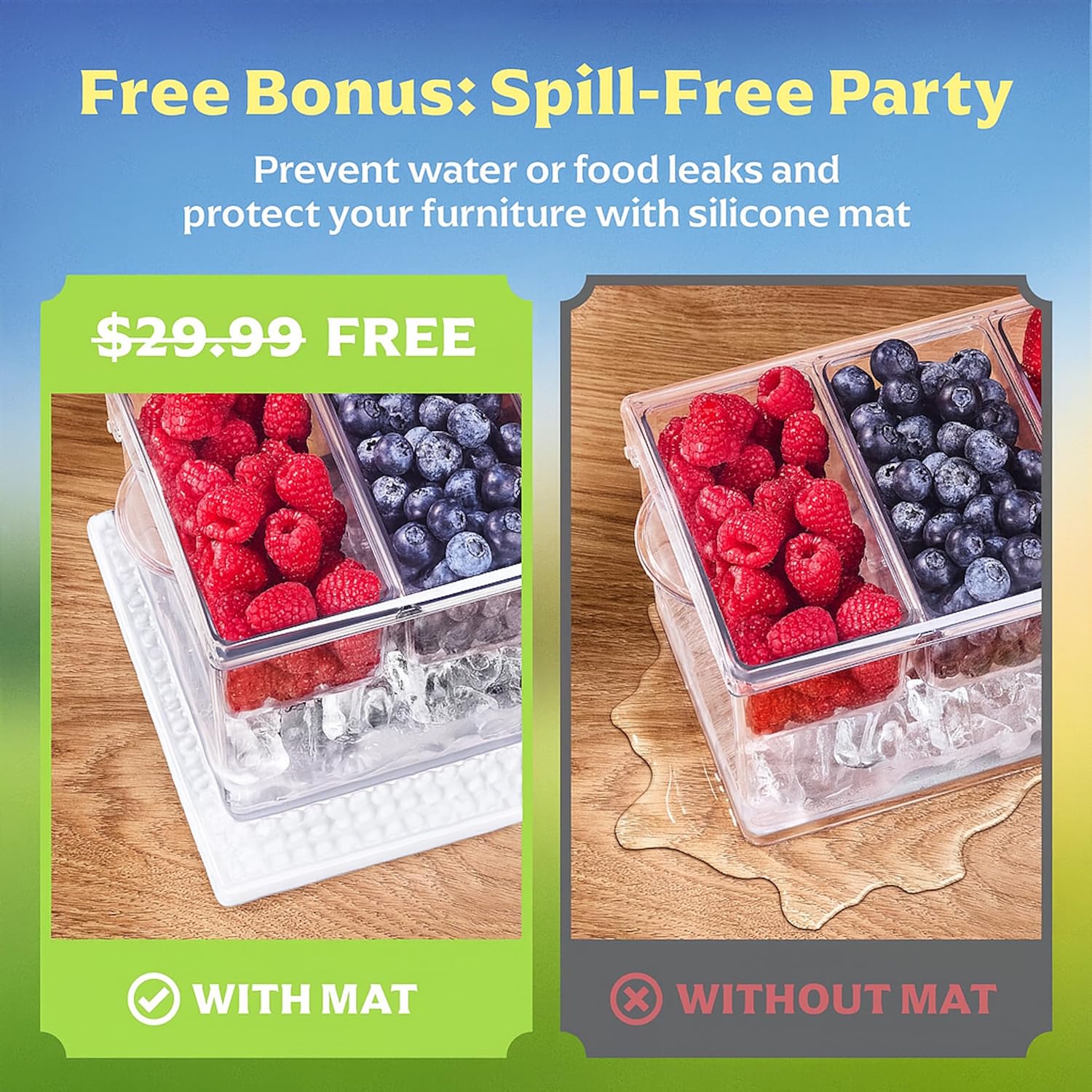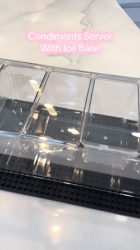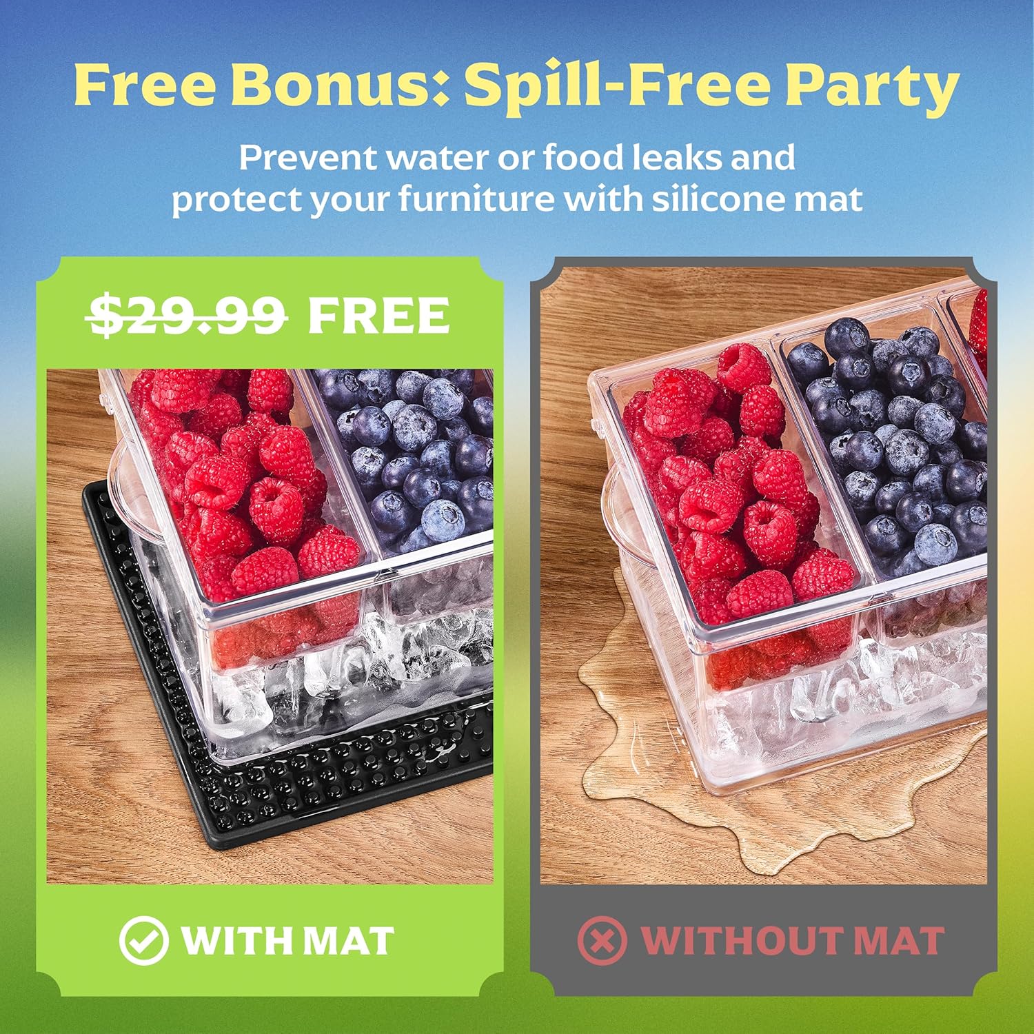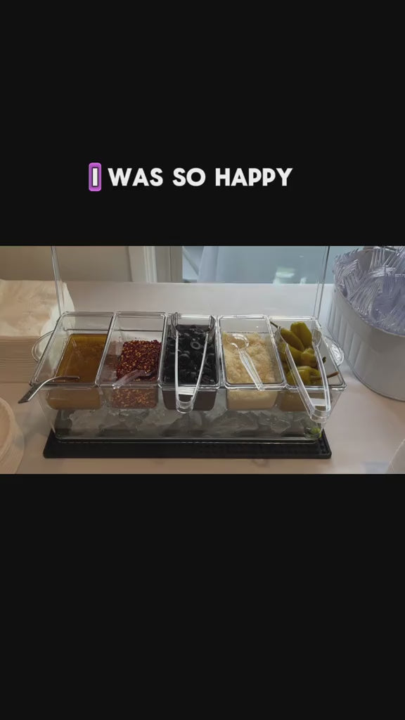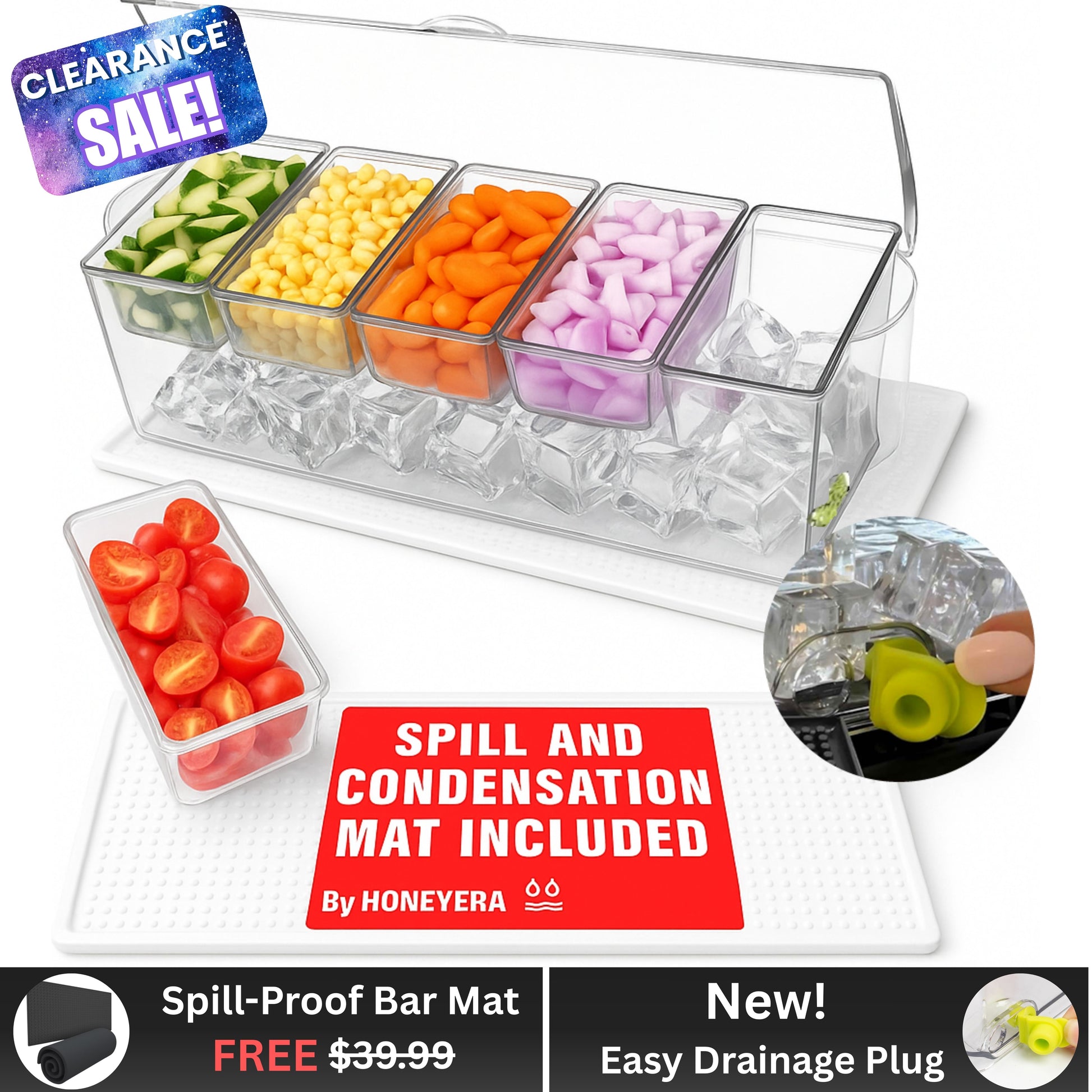 1× chilled condiment server with ice chamber, 5× removable compartments, 1× one-piece lid, 1× side drainage plug, and a rubber bar mat to catch condensation and prevent slipping.